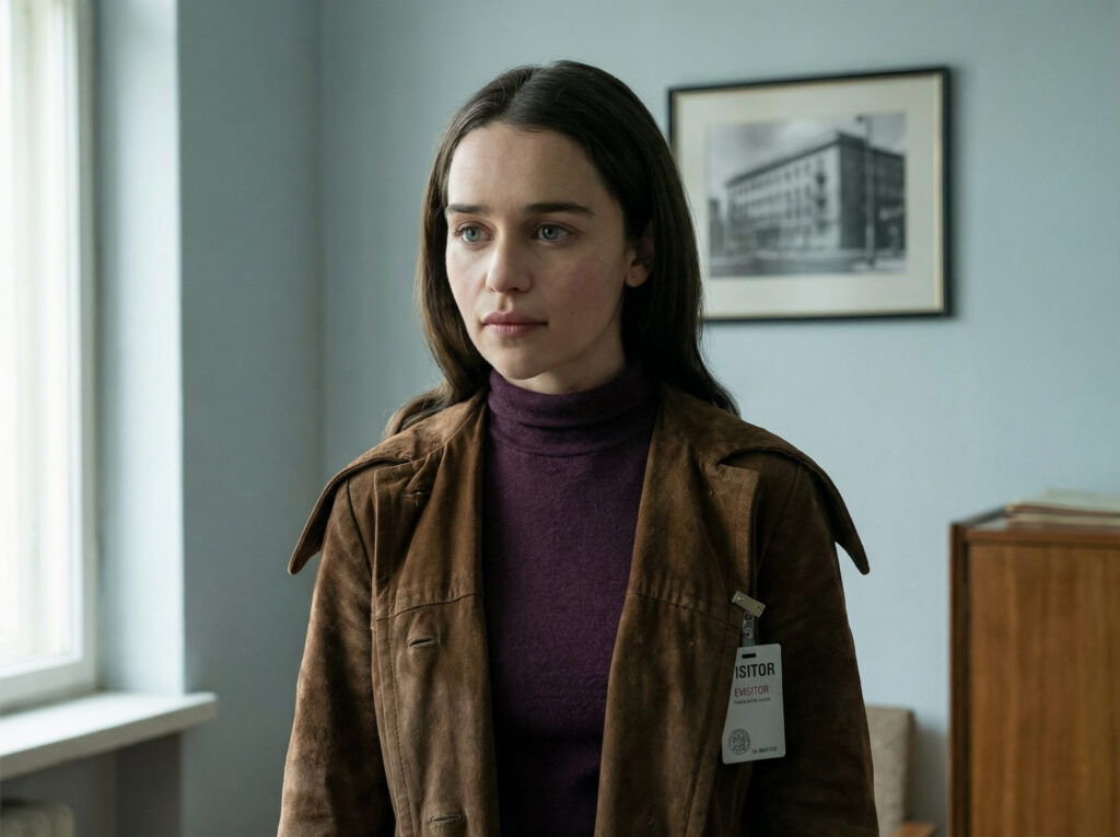 In contrast, Emilia Clarke dresses Bea in a wardrobe built on restraint and practicality.